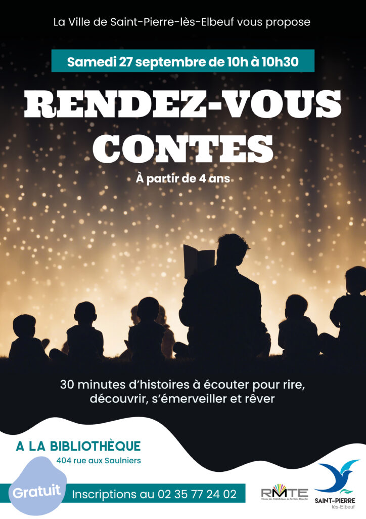 30 minutes d’histoires à écouter pour rire, découvrir, s’émerveiller et rêver A partir de 4 ans A la bibliothèque, 404 rue aux Saulniers Samedi 27 septembre de 10h à 10h30 Inscriptions au 02 35 77 24 02